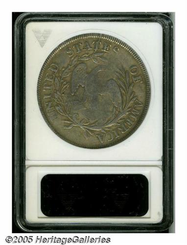 <B>1798<S$1> Small Eagle, 13 Stars--Repaired, Whizzed--ANACS. VF Details, Net Fine 12.</B></I> B-1, BB-82, R.2. Easily attributed by the die crack through the second T in STATES, although the break is not as advanced as sometimes seen. Despite the disclaimers, not a bad appearing coin and a good type coin choice for the budget-minded collector.