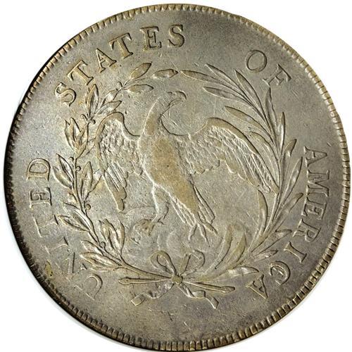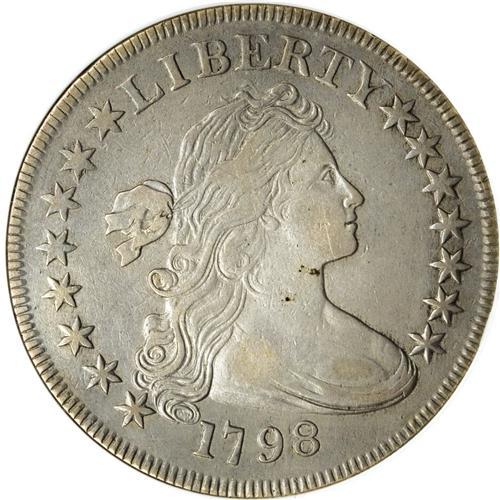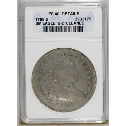 <B>1798 S$1 Small Eagle, 15 Stars--Cleaned--ANACS. XF40 Details.</B></I> B-2, BB-81, R.3. This is the Small Letters reverse die. Light gray surfaces reveal traces of faded orange, and are devoid of significant abrasions. Some fine hairlines are only visible under high magnification. The design elements retain nice detail, and the dentilation shows on both sides, being particularly strong on the obverse. A very respectable piece, despite the ANACS disclaimer.<BR><BR><b>Shipping:</b> Coin/Currency (<a target="_blank" href="http://www.heritageauctions.com/common/shipping.php">view shipping information</a>)