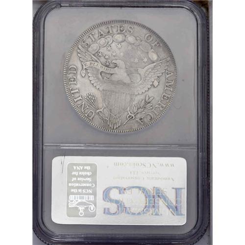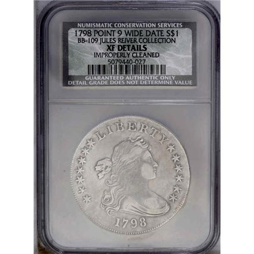 <B>1798<S$1> Wide Date. B-10, BB-109, R.4--Improperly Cleaned--NCS. XF Details.</B></I> Die chip between bust and star 13; Die chip below end of stem. Reiver die state a. Bowers-Borckardt die state III. A fairly scarce variety that is often misattributed as it shares a very similar reverse with the B-13, BB-108 variety. The surfaces are harshly cleaned and the coin is a mottled gray color. Weakly struck as often seen, with the central details on Liberty's hair quite shallow and some of the stars above the eagle missing as well as most of the dentils. Identifiable by a short scratch in Liberty's hair close to the ribbon knot, and another near the inside point of the first obverse star. Often this variety is found with very weak dentils on the right side of the obverse, as seen here. For the variety, this is still a respectable coin. On this slightly later die state, the obverse die has a thin die crack from below the date at the rim up through several stars on the left.<BR><I>Ex: John Haugh (9/14/1998).</B></I> Envelope Included.