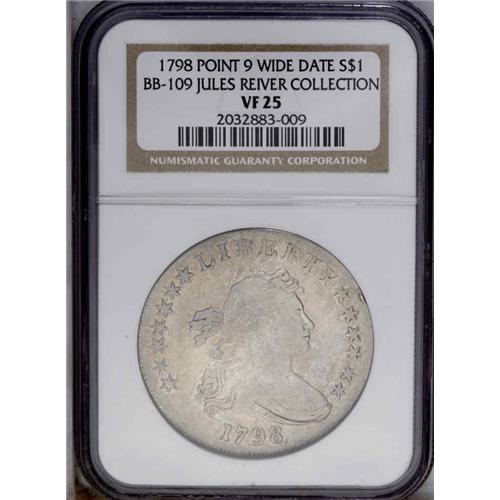 <B>1798<S$1> Wide Date. B-10, BB-109, R.4. VF25 NGC.</B></I> Die chip between bust and star 13; Die chip below end of stem. Reiver die state a. Bowers-Borckardt die state III. An attractive example of this scarce variety that shows traces of luster in the protected areas, and the usual soft strike on Liberty and the dentils and the reverse stars on the right. Clean surfaces for the grade, and the only nick worth noting is a rim nick between the eighth an ninth obverse stars. A difficult variety to locate in grades of XF or finer.<BR><I>Ex: Jacque and A. J. Ostheimer Sale; Lester Merkin (September, 1968), lot 252.</B></I> Envelope Included.