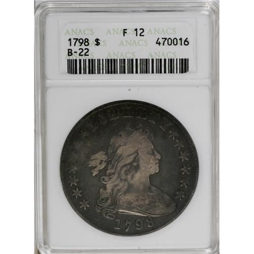 <B>1798 S$1 Wide Date Fine 12 ANACS.</B></I> B-22, BB-104, R.4. Gold-gray toning accents the central devices, which stand out from the well-worn charcoal-gray fields. Uneven striking pressure has caused the left side of the piece to be weaker than the right.<BR><BR><b>Shipping:</b> Coin/Currency (<a target="_blank" href="http://www.heritageauctions.com/common/shipping.php">view shipping information</a>)
