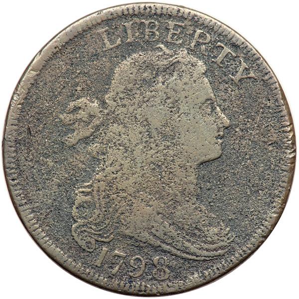 1798 S-149 R4+ Style I Hair with Large 8 G5. Several points sharper but covered with very fine porosity. No marks or verdigris. The date and legends are complete and clear. Dark steel and olive with lighter steel brown toning on the devices. EDS, Breen state I, prior to any swelling at OF.
