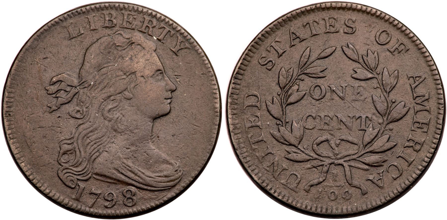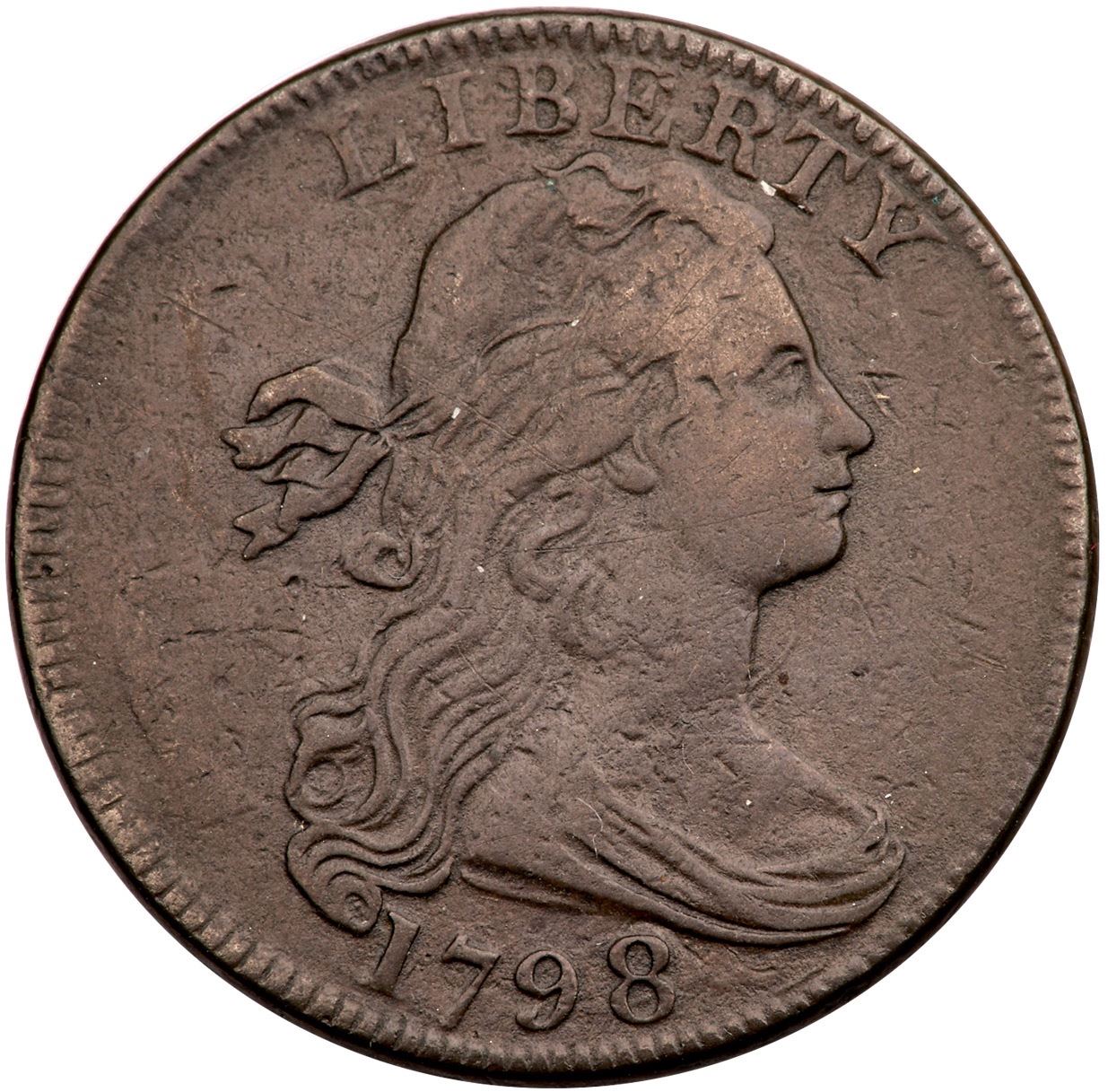 1798 S-153 R-3 VF20Style I Hair. 5 points sharper but there is very light microgranularity on the surfaces as well as a couple old hairline scratches on the central reverse. There are also a couple nicks before the eye and one behind it. Semi-glossy medium brown and olive brown. LDS, Breen state Vi with all the die cracks present but no rim cud off the bust tip yet. Ex; Jules Reiver - 2010 LBCP More - Buck Burgess