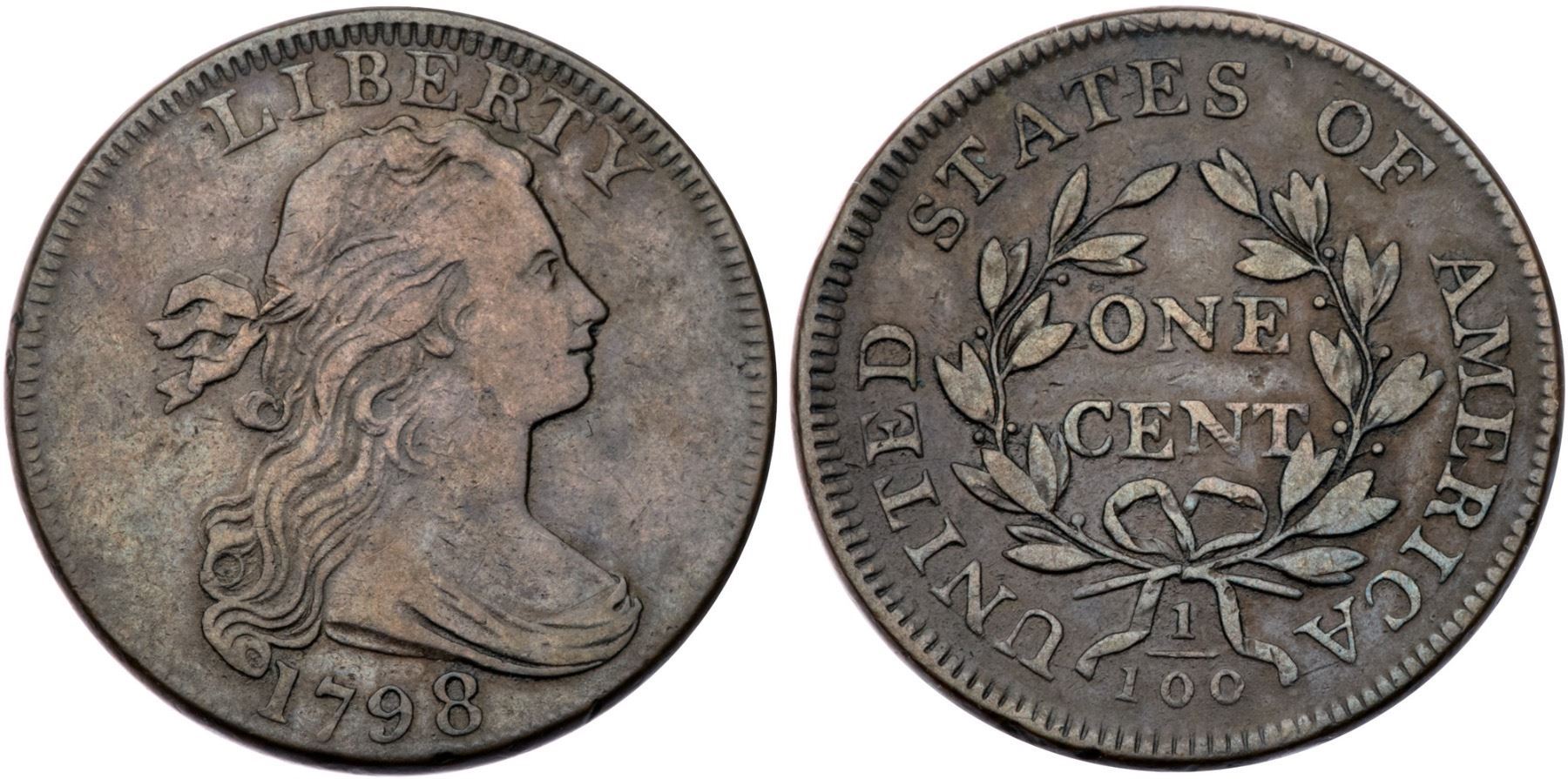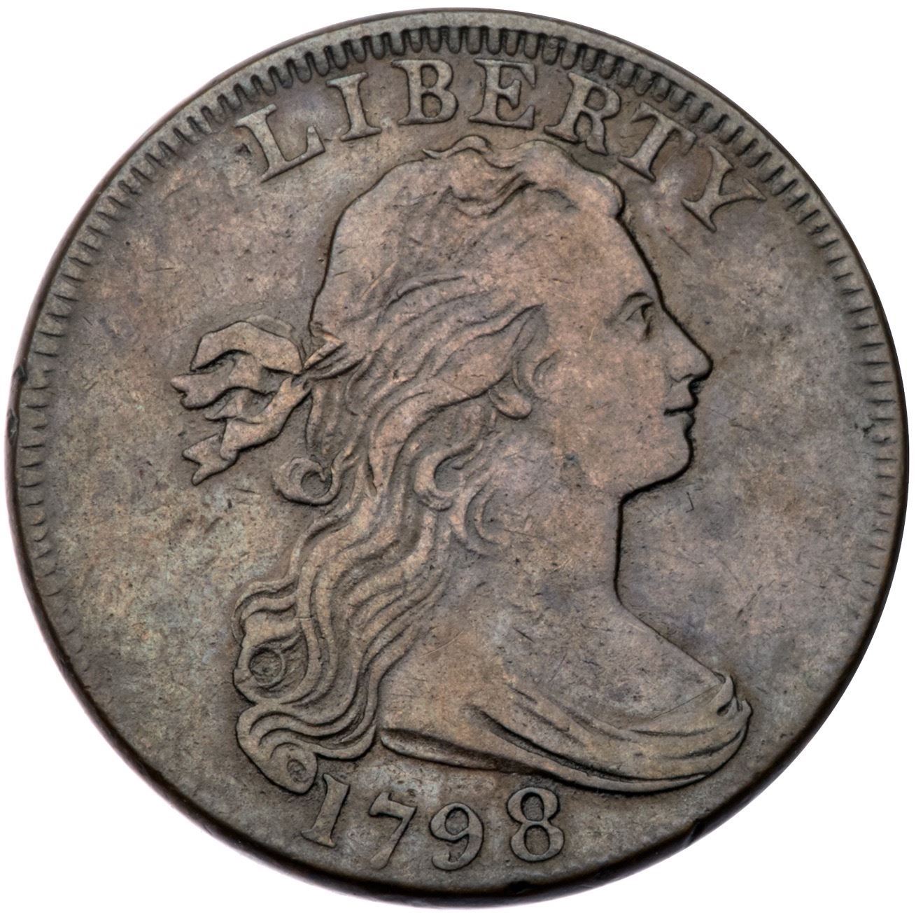 1798 S-153 R3 Large 5, Style I Hair F15Glossy brown and chocolate with lighter brown on the highpoints. Smooth and attractive with no notable defects, just even wear. EDS, Breen state I, before any die clashmarks or cracks on the obverse. Called F15 net VG10 by Noyes (no idea why there is a deduction), his photo #27417.Certificate Number: Pedigree: From the Fred H. Borcherdt Collection