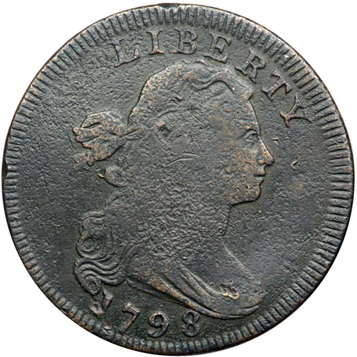 1798 S-155 R3 Small 8, Style I Hair, Reverse of 1796 G5. Sharpness VG10 but most of the planchet is covered with fine to moderate roughness. No verdigris. The only significant marks are a nick on the bottom of the 1 in the date and a small dig under the second T in STATES. Slightly glossy dark olive brown. M-LDS. The date is bold and the legends are complete, including the single leaves at the top of the wreath (reverse of 1796 style). An important "Redbook" type.