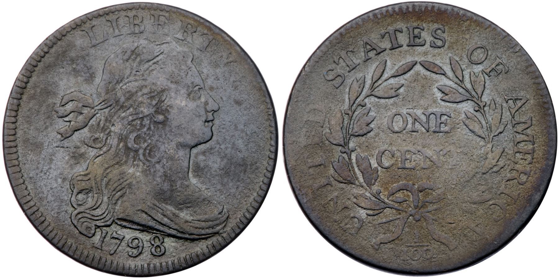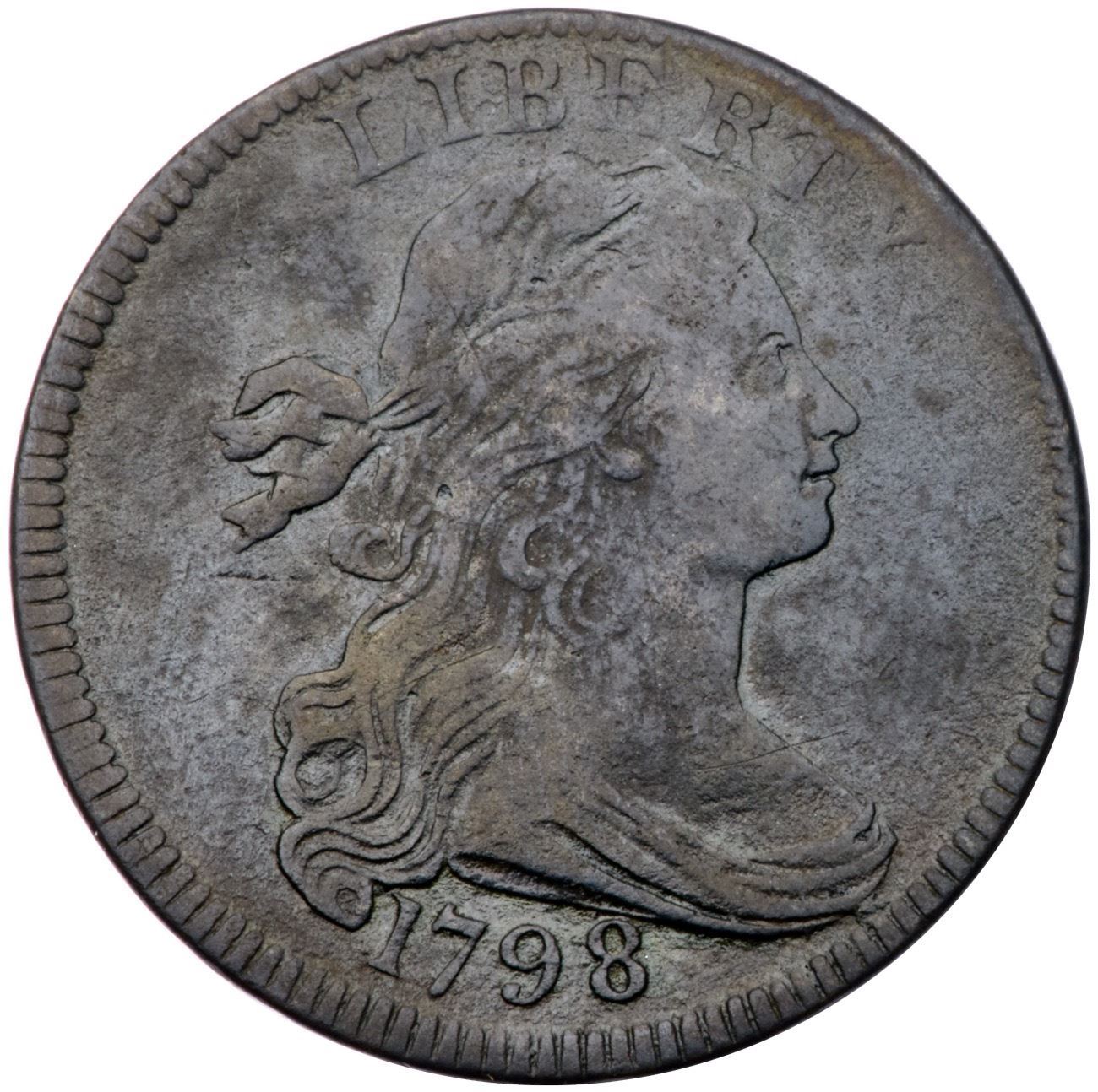 1798 S-156 R5+ Small 8, Reverse of 1796 VG8Sharpness F12 with very fine granularity covering the fields and protected areas under rather glossy dark olive brown and steel. There is a trace of shallow green verdigris around the date and the only mark is a tiny, light scratch under the hair ribbon. The date is bold and the legends are clear. MDS, Breen state II, with a die crack at the bust. Graded net VG8 and tied for CC#11 in the Bland census. Noyes says F12 net G5 and tied for CC#16, his photo #27517.Certificate Number: Pedigree: Ex Superior 2/1976:1437 (large lot)-Gordon J. Wrubel-Myles Z. Gerson 8/1980-Denis W. Loring 8/1980-Fred H. Borcherdt Collection