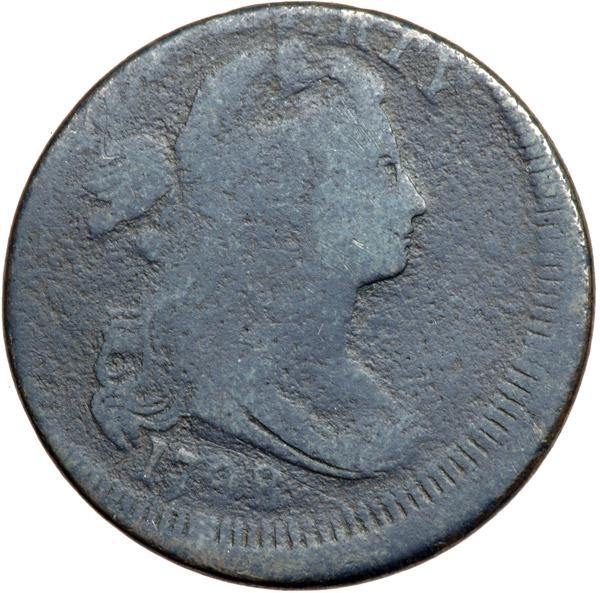 1798 S-157 R2 Small 8, Style I Hair G5. Off Center. A couple points sharper but covered with fine roughness that dulls the natural gloss of the surfaces. No notable verdigris or contact marks. Slightly glossy very dark steel and olive. Struck 10% off center to K-10.5.