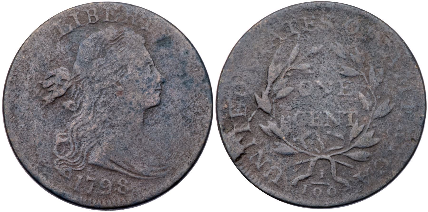1798 S-158 R4 Small 8, Style I Hair G6Several points sharper but covered with light to moderate corrosion. No notable verdigris or contact marks. A small planchet flake at the rim over the R in AMERICA can help identify this cent. Slightly glossy dark chocolate brown and steel. Not a pretty cent but the date is strong and the legends are clear. Extremely rare M-LDS, Breen state V, with a strong cud break connecting IT to the rim above. Only five examples of this die state are known to us. Graded F15 net G5 in the Noyes census, his photo #29269.Certificate Number: Pedigree: From the Fred H. Borcherdt Collection