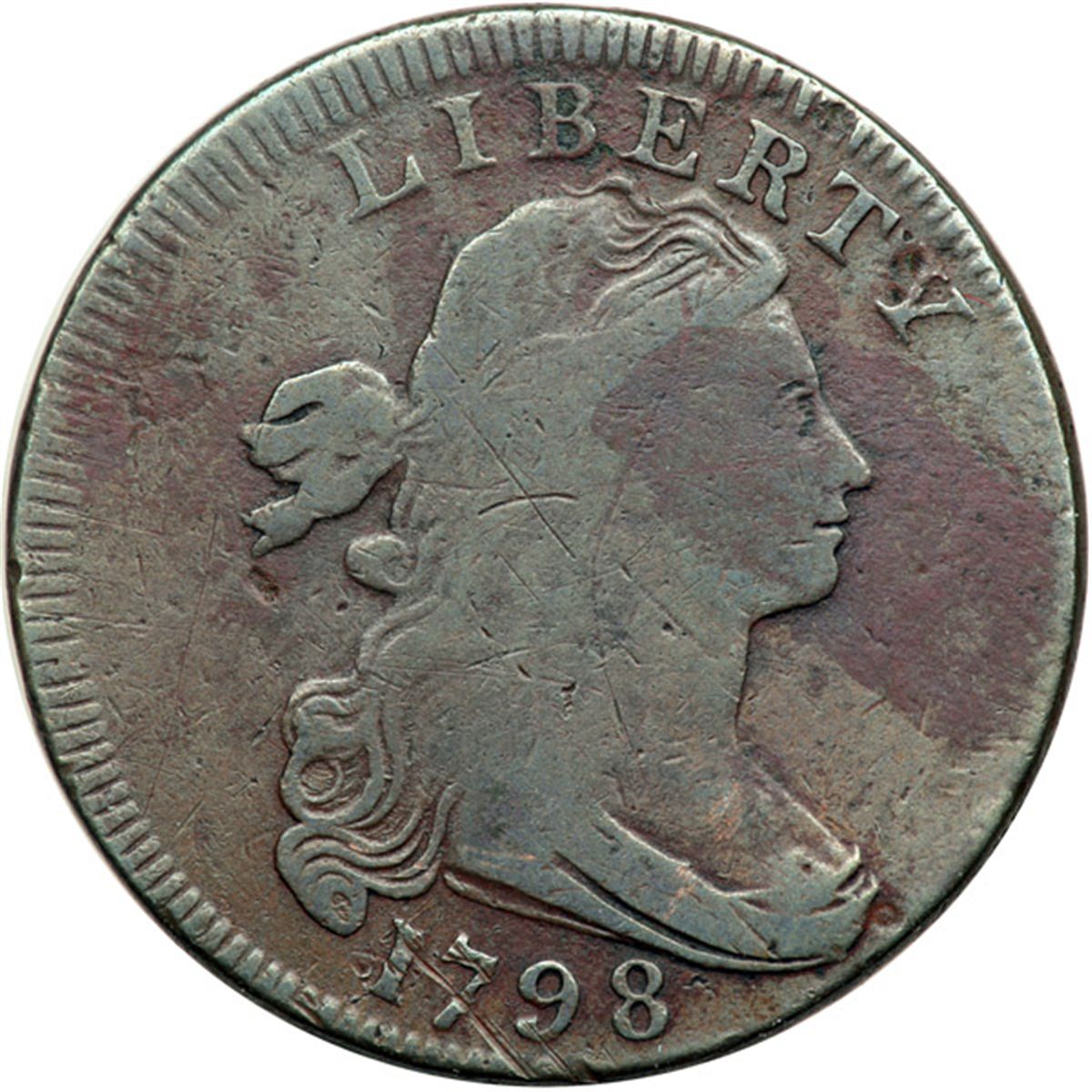 1798 S-160 R3 Small 8, Style I Hair VG7. Off Center. Very slightly sharper but there is a diagonal scratch through the 17 and a dull but strong rim nick over the T in UNITED. Rather glossy light olive and steel brown with splashes of reddish chocolate toning on the obverse. MDS. Struck slightly off center to K-4. The date and legends are complete and bold.
