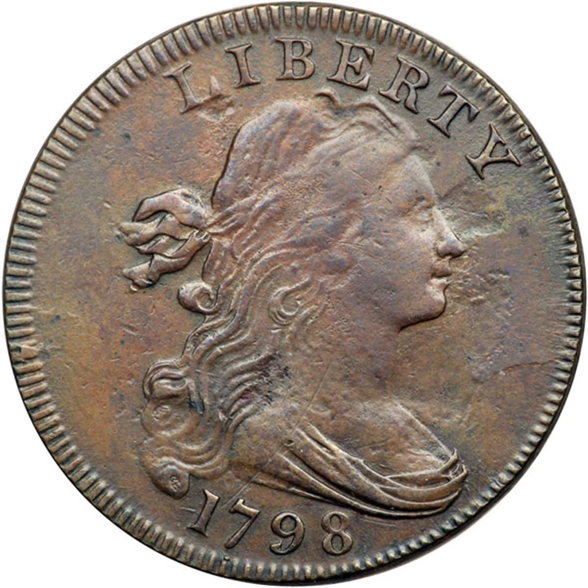 1798 S-161 R2 Small 8, Style I Hair VF30. Nice glossy medium brown and light chocolate. The surfaces are smooth and there are only a few minor marks, including a faint scratch down the shoulder and a small patch of very shallow reddish roughness hidden in the hair at the shoulder. The only significant "defect" on this piece is the blunt strike on the portrait, which was caused by grease or other debris on the die when it was struck. Otherwise this piece is nearly choice. E-MDS, Breen state IV. The die cracks at TATES-O are clear but there are no cud breaks.