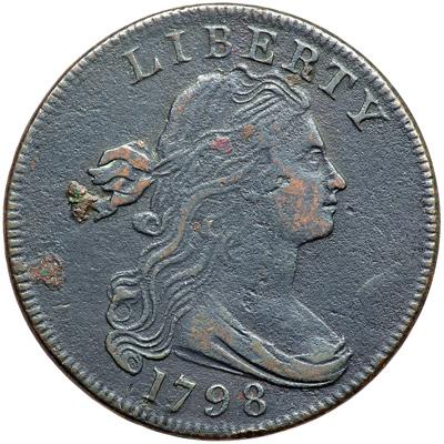 1798 S-161 R2. Fine-12. Style I Hair with Small 8. Sharpness VF25 but covered with very fine roughness and there are a couple small spots of shallow reddish brown verdigris on the obverse. Dark steel and olive with lighter chocolate toning on the highpoints. The obverse is a bit glossy while the reverse is closer to matte. Rare M-LDS, Breen state VIII, with an incomplete cud break over ATE. The sliver of die at the rim over TE is still attached creating small dentils at the top of the cud in that area. Only a few are known in this intermediate die state, a state that was missing from the Holmes collection.