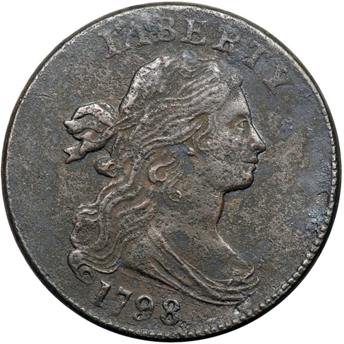 1798 S-163 R4 Small 8, Style I Hair VG10. Sharpness VF35 or slightly better but covered with uniform fine granularity. No verdigris. The best identifying mark is a small planchet flake nestled close under the bust tip. Olive and dark steel brown. EDS. Great detail for the variety but dull from the fine roughness.