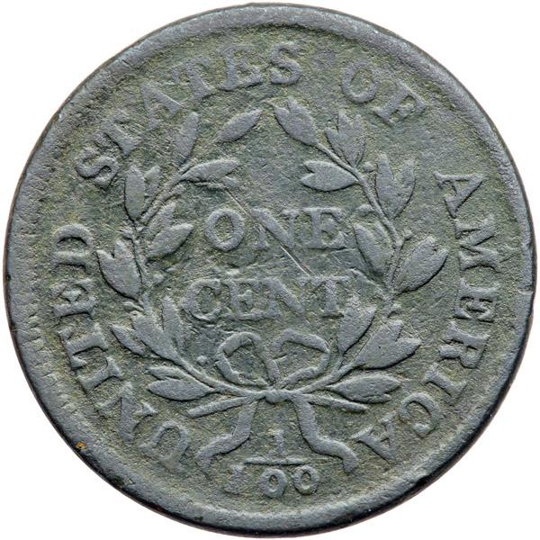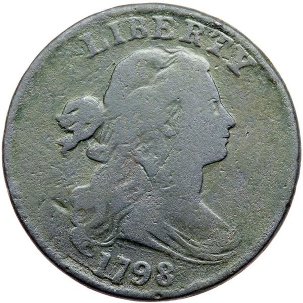1798 S-163 R4 Style I Hair with Small 8 G6. Sharpness VG10 but dull thanks to uniform extremely fine roughness under a slightly glossy dark greenish olive and steel patina. The only notable mark is a thin diagonal scratch through the N in ONE. The date is strong and the legends are clear. Scarce MDS, Breen state VI, with a sunken retained cud break from the bottom of the 17 to under the lowest curl. The date and legends are complete and clear.