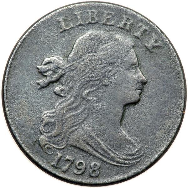 1798 S-163 R4 Style I Hair with Small 8 VG10. Sharpness VF25 but dark and covered with uniform moderately strong granularity. No marks or verdigris. Slightly glossy very dark olive and steel. The date and legends are strong. MDS, Breen state VI, with a slightly sunken retained cud break under the 17 and adjacent curl.