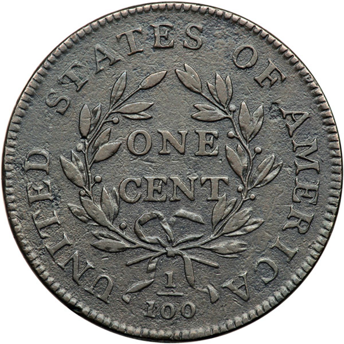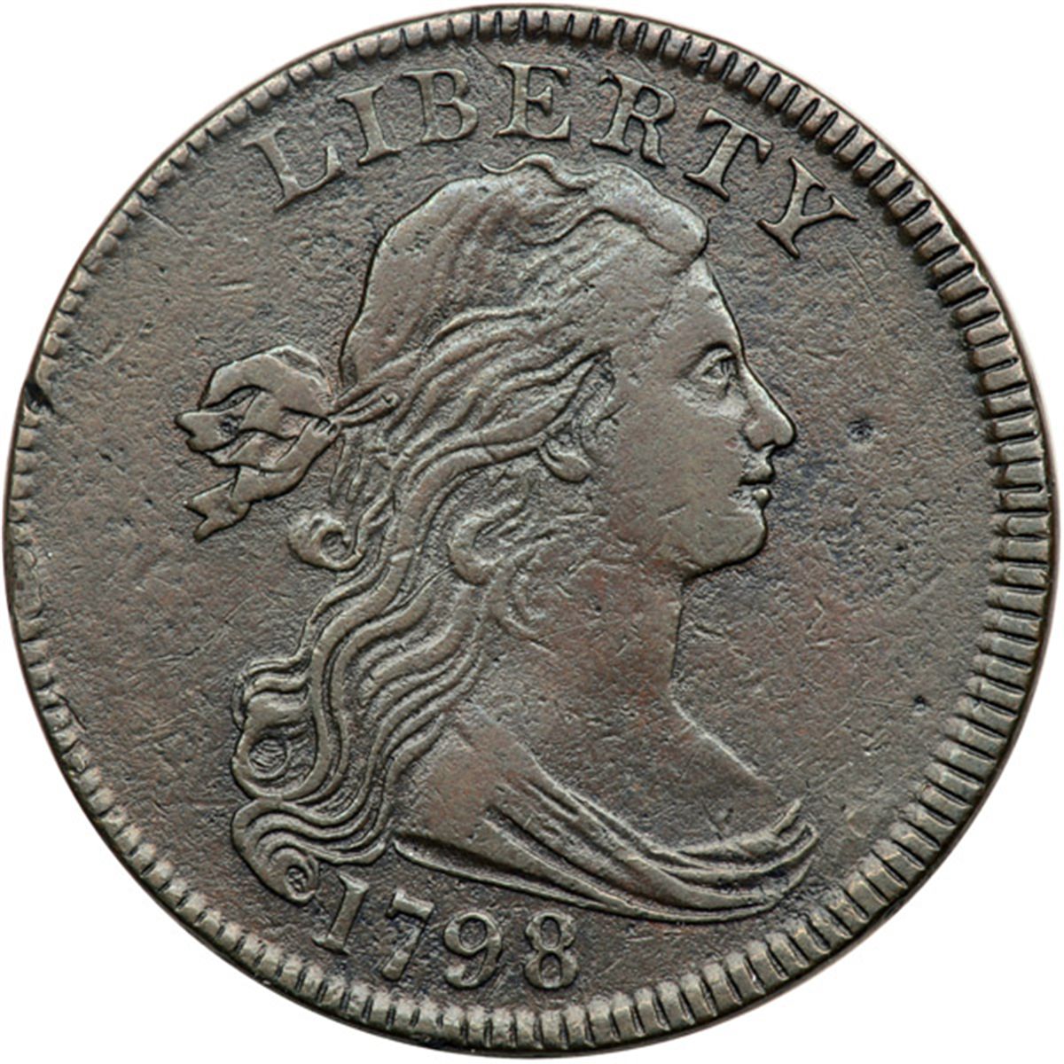 1798 S-164 R4 Small 8, Style I Hair F15. Ten points sharper but there is some extremely faint roughness in the fields and protected areas on both sides. There is no trace of verdigris, and the only evidence of corrosion visible without the aid of a strong glass is a small pitmark in the field off the tip of the nose and a very shallow pitmark at the left foot of the first A in AMERICA. The only contact marks are a rim nick left of the hair ribbon and a small rim bruise below the nick. The color is a very attractive glossy chocolate brown, and the toning effectively hides the minor imperfections. Has the sharpness and eye appeal of a higher grade. EDS, Breen state I. This is the plate coin for the die state in the Breen encyclopedia on the series.