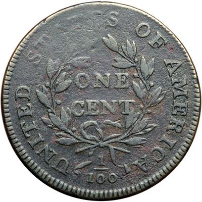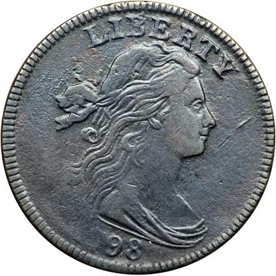 1798 S-164 R4 Style I Hair with Small 8. Fine-12. Sharpness VF20 or slightly better but the surfaces are covered with very fine roughness that’s partially hidden under a glossy dark olive and steel brown patina. There are traces of fine verdigris dusted on both sides, including a small spot of reddish crust just right of the F in OF. The only notable contact mark is a small rim nick over the A in STATES, and it is not at all distracting. MDS, Breen state III. Heavy bulges at the drapery and lowest curl from die failure cause weakness on the lower obverse details with similar weakness at STATES on the opposing side. The obverse die was warping. Otherwise the date and details are all strong. Removed from an NCS slab graded VF details with environmental damage (NCS label included, and it shows the attribution and Reiver provenance). DWH #2869.