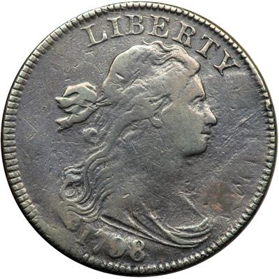 1798 S-164 R4 Style I Hair with Small 8. VG-10 Plus. Slightly sharper but there is a lightly abraded spot in the field over the bust tip, the abrasion so light it barely breaks the patina. Several fine parallel scratches down through the bust, another at the top of IBE in LIBERTY, and a few more above ES-OF are visible but offer only minor distractions. No corrosion or verdigris. Glossy bluish steel brown and chocolate. M-LDS, Breen state V, with strong swelling that weakens the date and lowest curl. Strong die clashmarks from AMERICA show near the dentils before the portrait. DWH #3054.