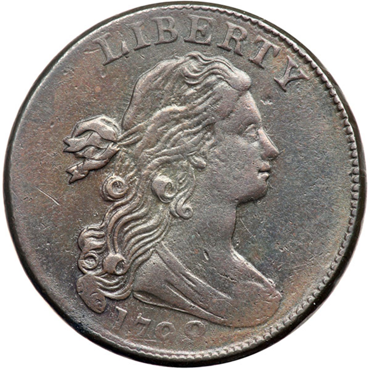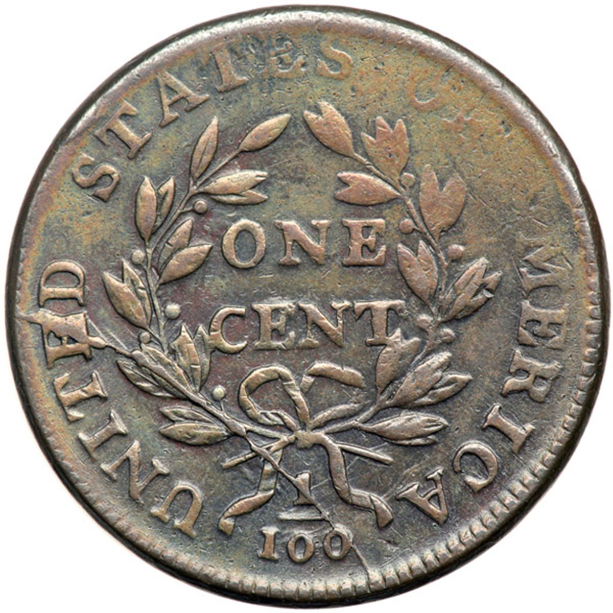 1798 S-166 R1 Large 8, Style II Hair VF30. Ten points sharper but lightly cleaned and retoned glossy light greenish olive and chocolate mixed with some lighter brown toning on the reverse. No roughness and only a few trivial contact marks. However, the strike was uneven leaving significant weakness on the bust and bottom of the 98 with similar weakness on the opposing S-OF and leaves below. LDS, Breen state VI. The die crack arcing through the lower left reverse is strong and the section through E in UNITED is wide and lumpy.