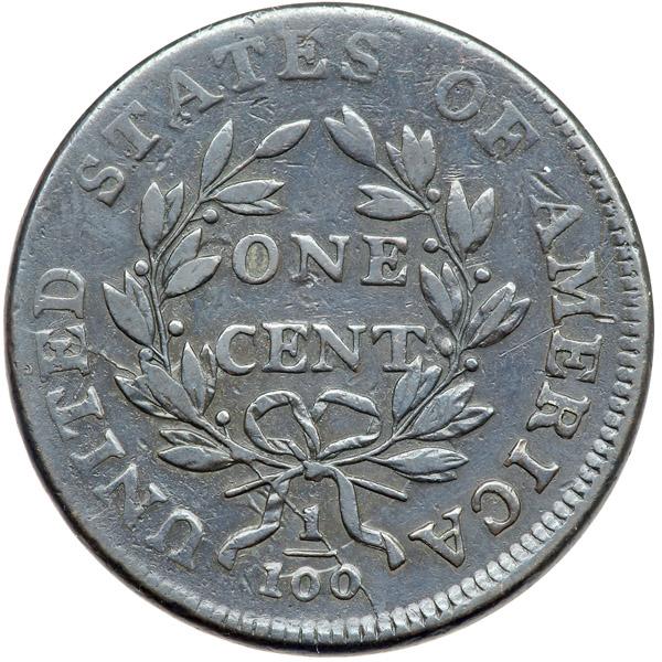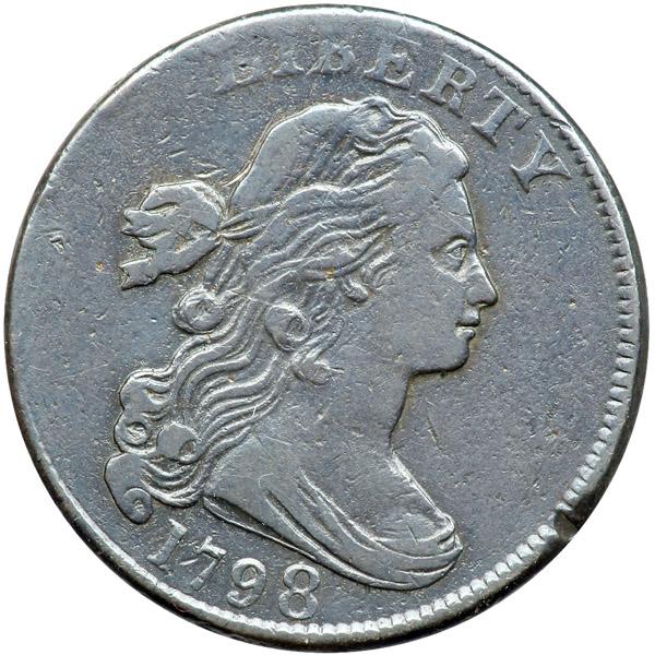 1798 S-166 R1 Style II Hair, Large 8 F12. Sharpness near VF20 but there is a deep rim nick above the bust tip. Otherwise the surfaces are smooth and attractive with only trivial signs of contact. Glossy dark steel and olive brown. E-MDS with the usual die crack arcing across the lower left quadrant of the reverse. Struck slightly off center to K-10.