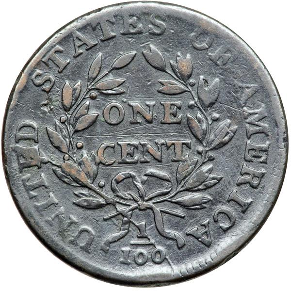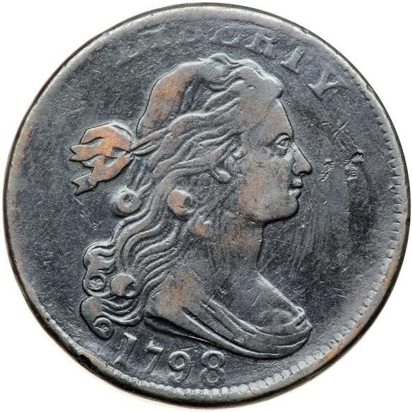 1798 S-166 R1 Style II Hair with Large 8 VG10. A couple points sharper but there are two shallow digs in the field before the nose and another under the first S in STATES, plus a couple light rim bruises at the bottom of the reverse. Glossy dark chocolate and olive brown with lighter chocolate brown toning on the highpoints. The date and legends are complete and clear. LDS, Breen state VI, with the reverse rotated 30 degrees CCW from a normal head-to-foot die orientation.
