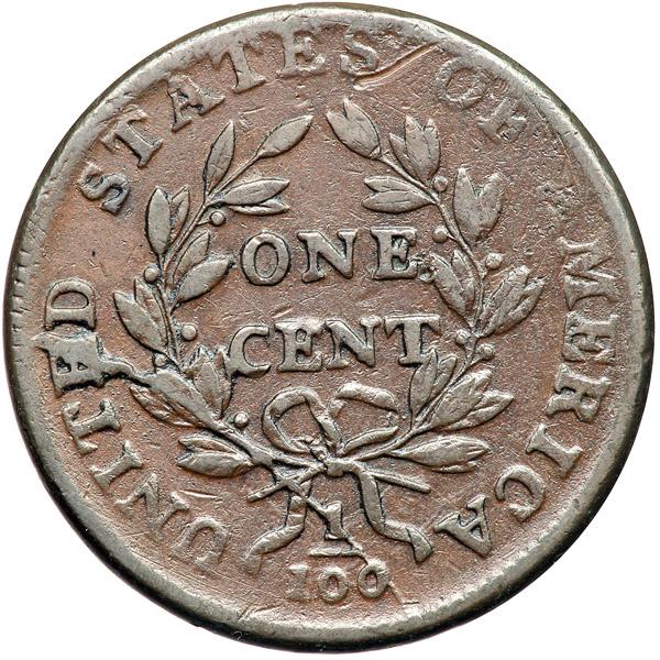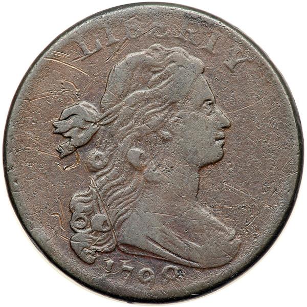 1798 S-166 R1 Style II Hair with Large 8 VG8. Sharpness F15 but the obverse is covered with light contact marks including a stronger scratch from the lower end of the ribbon to the curl at the shoulder. All the contact marks blend perfectly into the natural toning, but there are far too many than normal for the sharpness grade. The reverse, however, is very nice with only a short, dull scratch just right of the second S in STATES. Glossy chocolate with slightly darker steel brown toning on the highpoints. LDS, Breen state VI. The die crack that arcs through the fraction and E in UNITED is strong and the reverse is rotated 35 degrees CCW relative to the normal head-to-foot die orientation. The date and legends are complete and easily readable.