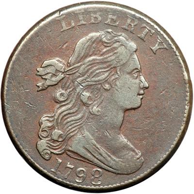 1798 S-166 R1. VF-25 Plus. Style II Hair with Large 8. Close to VF30. The surfaces are attractive and free of verdigris or notable marks, but the gloss is a bit subdued by extremely faint granularity that is visible under strong magnification. Slightly glossy steel and olive brown with frosty lighter reddish chocolate toning in protected areas. Nicely struck E-MDS, Breen state III early. The always-present die crack through E in UNITED is light.