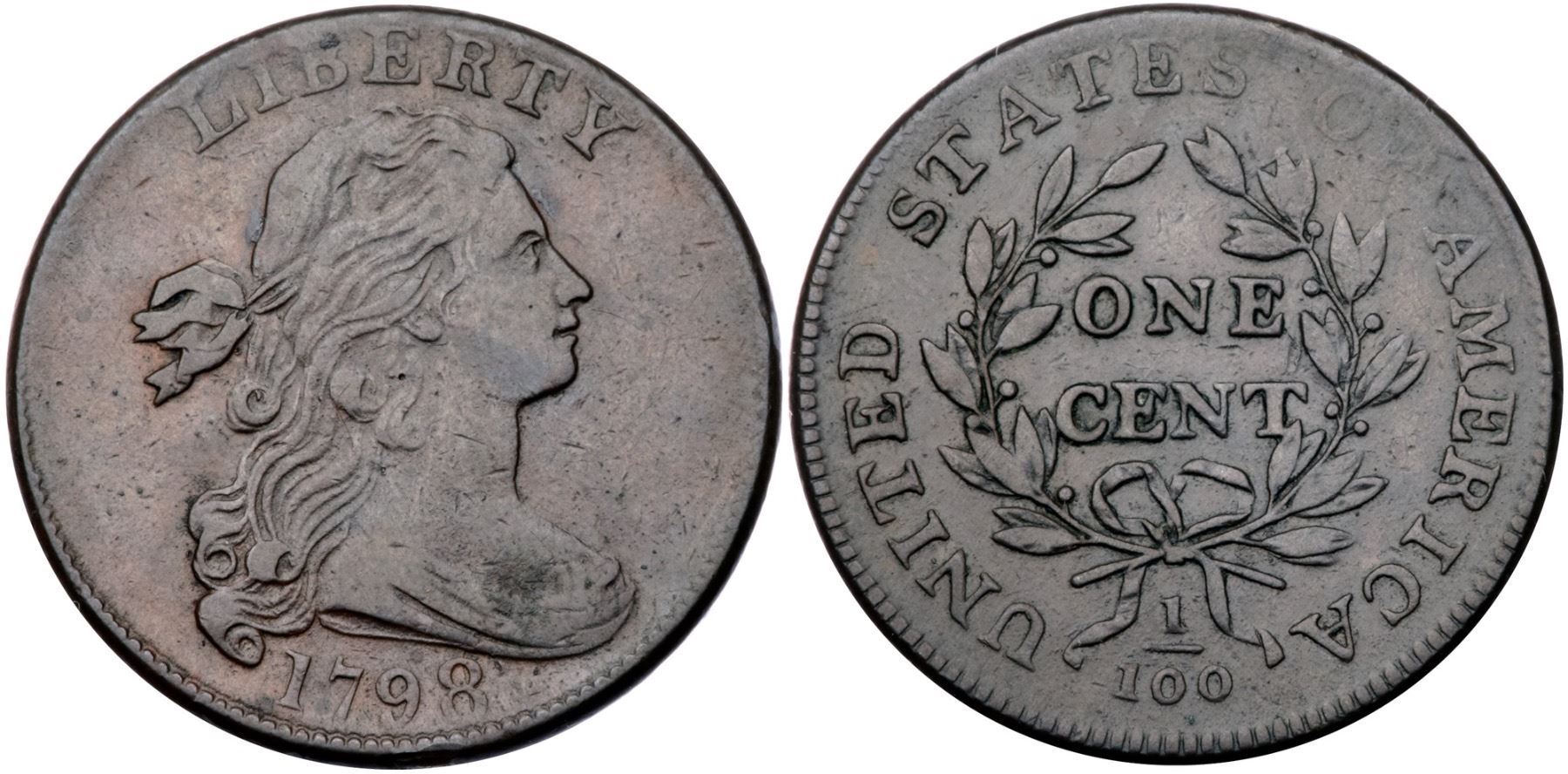 1798 S-167 R1 Large 8, Style II Hair VF25Glossy chocolate brown and steel with lighter brown in protected areas on the obverse. Lightly worn and smooth except for a patch of microscopic roughness and verdigris on the bust. A vertical nick over the right top of the T in CENT is the only other notable defect. EDS but not the earliest, Breen state I late, with very light die chips on the reverse. The number "10" is neatly punched into the edge below the date, most likely to identify this piece as the Proskey 10 die variety.Certificate Number: Pedigree: Ex Robert Le Blanc (Le Blanc Numismatics)-Denis W. Loring 6/1982-Fred H. Borcherdt Collection
