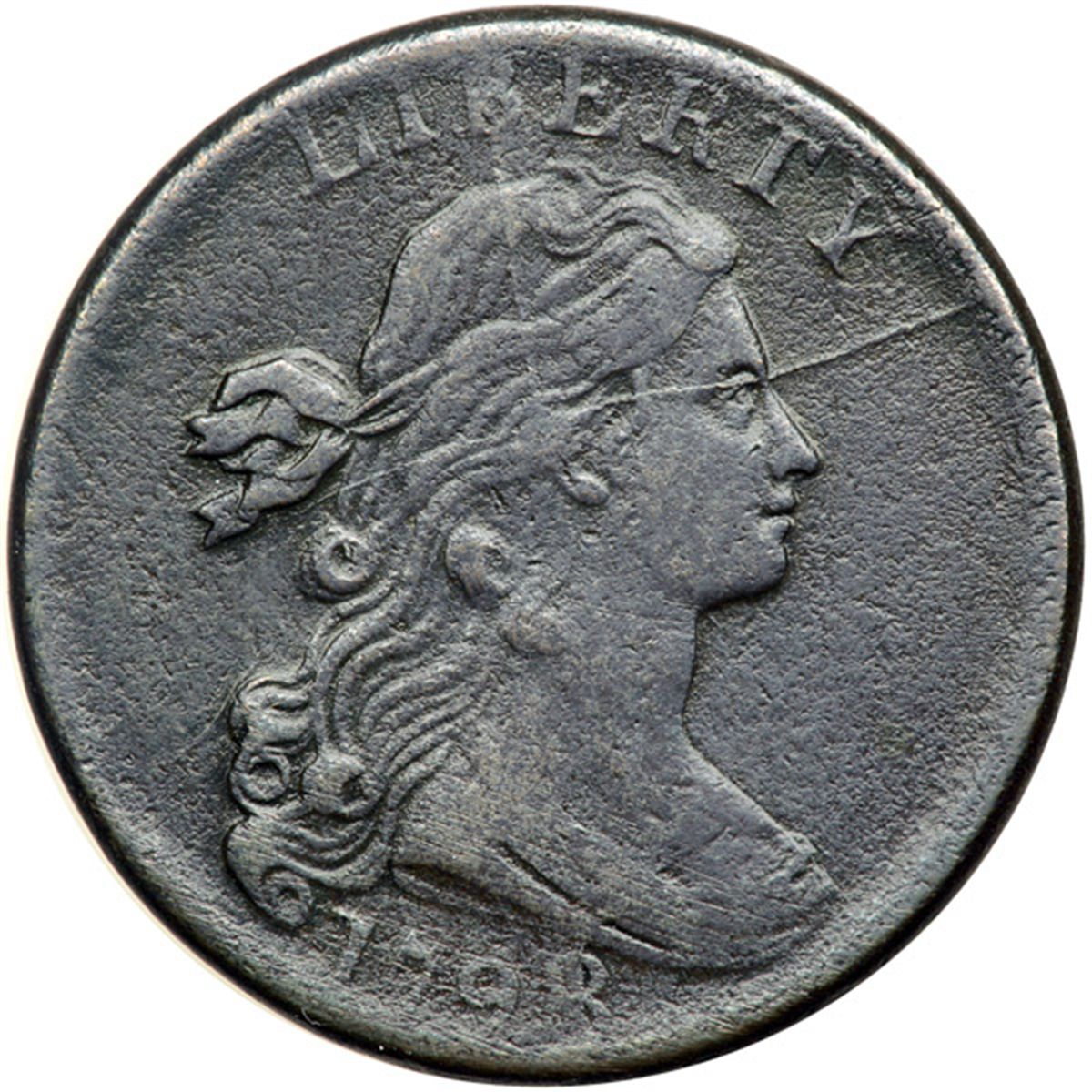 1798 S-167 R1 Large 8, Style II Hair VG10. Sharpness near VF20 but covered with uniform fine granularity under the slightly glossy dark steel toning. No verdigris. The only contact marks are fine old hairline scratches across the date, shoulder, and bust. These scratches are well hidden in the natural patina. LDS, Breen state VI. The die cracks are clear and the cud resting on the top of the first T in STATES is strong.