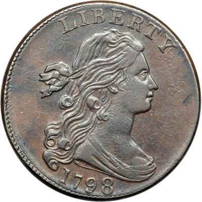 1798 S-167 R1 Style II Hair with Large 8. EF-45. Glossy medium brown and chocolate with delicate mottling of darker olive brown toning on the obverse and frosty flowline luster remaining in the fields and protected areas. The surfaces are smooth except for traces of extremely fine roughness around EN in CENT and a small planchet fissure in the field near the dentils off the mouth, as struck. MDS, Breen state III. A die crack extends from the eye to the rim right of the Y in LIBERTY. Removed from an NGC slab graded AU53BN (NGC label included, and the attribution is noted on the label). Graded EF45 by Del Bland, but not in the top 10 listed in his condition census. DWH #2782.