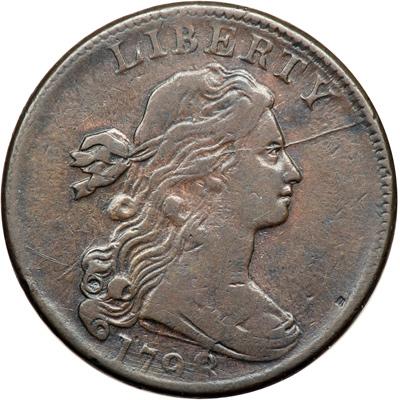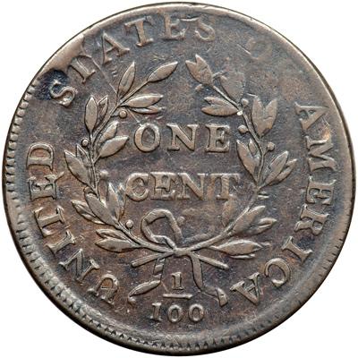 1798 S-167 R1 Style II Hair with Large 8. Fine-15. Five points sharper but there are some very fine pinscratches across the date plus another down the neck and one more in the field left of the lower curls. The marks are barely visible and the eye appeal is enhanced by the smooth surfaces. Glossy medium brown and chocolate with traces of very faded red in protected areas of the obverse due to an old cleaning. LDS, Breen state VI early. The top of the first T in STATES is joined to the rim by a small cud break, and a radial die crack passes through the right edge of that T down through the O in ONE to the center dot where it fades out. Removed from an NCS slab graded VF details with scratches and improper cleaning (NCS label included, and it shows the attribution and Reiver provenance). DWH #2870.