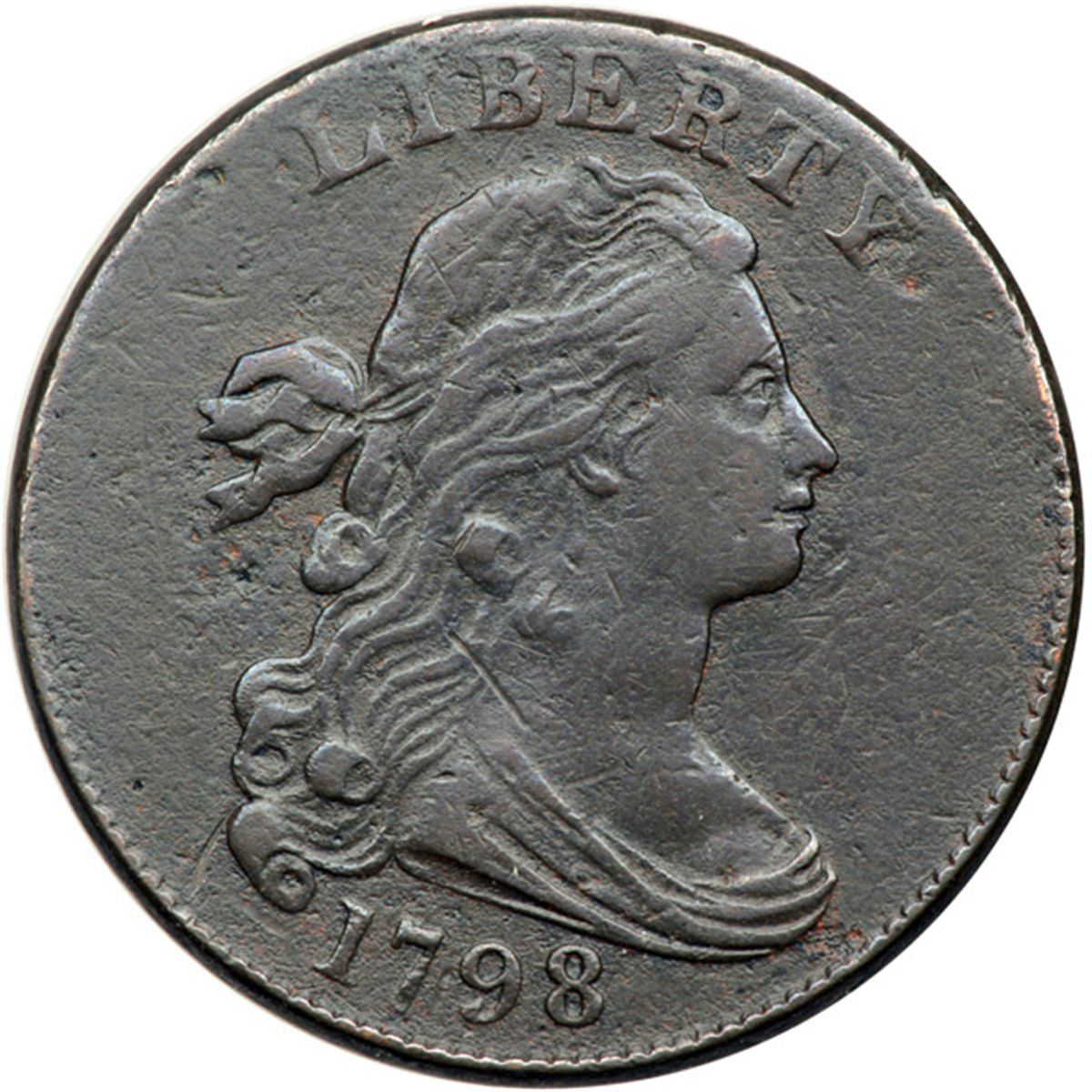 1798 S-171 R4 Small 8, Style II Hair F15. At least ten points sharper with microscopic roughness in the fields and protected areas, strongest around the lower end of the hair ribbon and at the Y in LIBERTY. Even in those places the roughness is trivial, and the glossy olive brown and chocolate toning gives this cent decent eye appeal. A short scratch on the shoulder is the only notable mark. Very rare EDS, Breen state I, without the die failure left of L in LIBERTY.