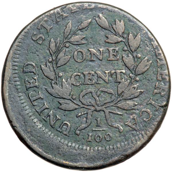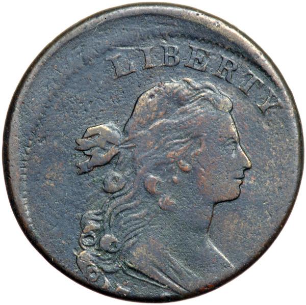 1798 S-172 R2 Small 8, Style II Hair VG8. Off Center. Sharpness F15 but covered with fine roughness, strongest on the reverse. There is some very fine greenish verdigris dusted into protected areas on the reverse. The only notable contact mark is a rim nick at the I in AMERICA. Slightly glossy dark olive brown with lighter chocolate toning on the high points. Struck 15% off center to K-4.5. Only the top edge of the date remains on the planchet.