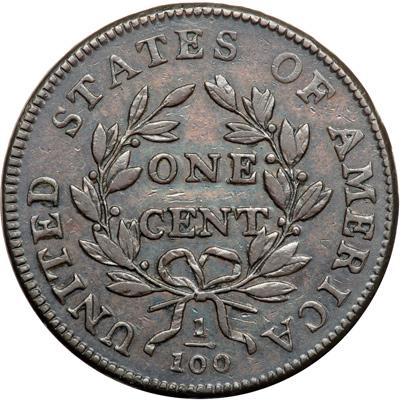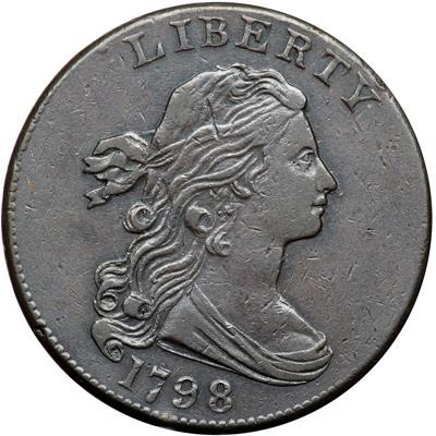 1798 S-172 R2+ Style II Hair with Small 8. VF-30. Double Profile. Sharpness near EF40 with too many light contact marks for the sharpness grade, the only notable ones a long, thin nick hidden in the hair under IB in LIBERTY and a very tiny rim bruise under the 9 in the date. Glossy chocolate and steel brown with delicate overtones of light bluish steel in protected areas. Sharply struck EDS, Breen state II, with smooth, slightly reflective fields on both sides. The tiny lumps from obverse die rust described by Breen for his state II are clear. In addition, there is sharp, clear doubling visible on both sides, including a double profile. The doubling is strongest on ONE and UNITED where the offset is much larger than normal for simple die bounce. Possibly a double struck cent that didn’t shift much between impressions. Not in the condition census for the variety, but a sharply struck cent with excellent eye appeal anyway. DWH #2785.