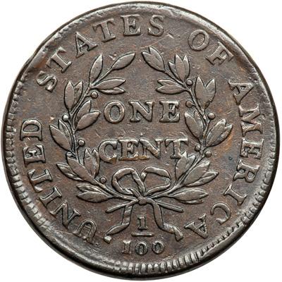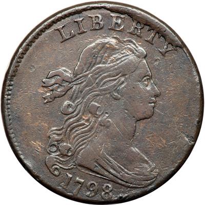 1798 S-173 R3- Style II Hair with Small 8. Fine-15. Rotated Reverse. Sharpness VF20 or slightly better but there are too many light contact marks for the sharpness grade. These include some dull nicks and fine hairline scratches on the obverse and a rim bruise at ST in STATES. Glossy chocolate and steel brown. The date and legends are all bold. M-LDS, Breen state VII, with a die crack at LI outlining a cud that later joins the tops of those letters to the rim above. In addition, a strong rim cud break at CA in AMERICA (Breen’s state IX) shows clearly on this example, thus proving Breen’s sequence of the later die states is incorrect. The reverse is rotated 50 degrees CCW. Removed from an NGC slab graded VF35 (NGC label included, and it shows the attribution and Reiver provenance). DWH #2873.