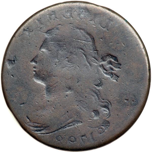 1798 S-174/175 R2/3 Small 8, Style II Hair G4. Obverse Brockage. Slightly sharper with a trio of shallow dents on the lower portion of the obverse, the strongest of these in the hair left of the shoulder. Otherwise the surfaces are nice and smooth, free of notable marks or roughness. The 179 are weak but readable and the 8 is clear. Glossy chocolate brown, darker in the protected areas and lighter on the high points. An obverse brockage strike with a normal obverse on one side and an incuse impression of that same obverse (brockage strike, struck against the obverse of a previously struck example that didn't eject from the coining press) rotated 30 degrees CCW from the normal obverse. The date on the brockage side is clearer than it is on the normal side, all 4 digits easily readable. Since this obverse die was used for both the S-174 and S-175 varieties, it is impossible to be sure which variety was being struck when this brockage error was minted. DWH #2285.