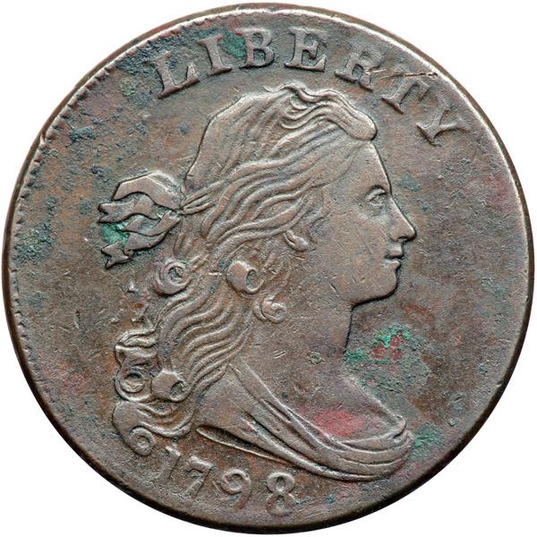 1798 S-174 R2 Style II Hair with Small 8 F15. Sharpness VF35 with a half dozen small patches of light corrosion and shallow greenish verdigris on both sides. The remainder of the planchet is a smooth glossy chocolate brown. The only marks are a shallow scuff at RT in LIBERTY and a couple tiny rim nicks right of the fraction. MDS. The die clashmarks through the numerator are strong.
