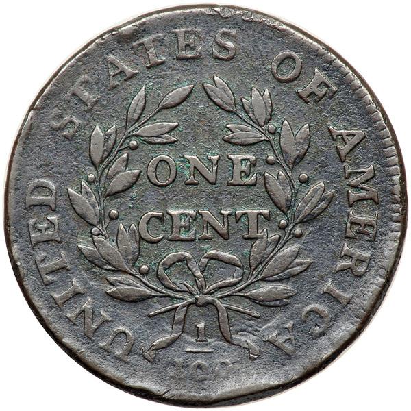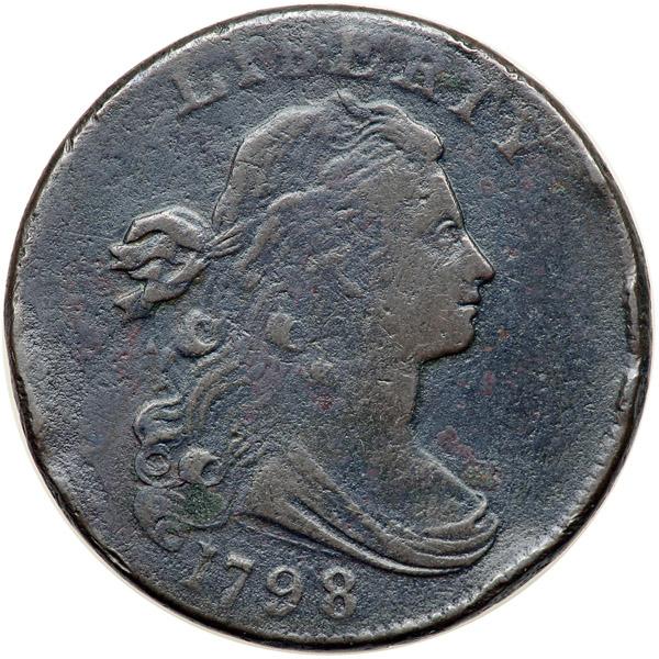 1798 S-174 R2 Style II Hair with Small 8 VG8. Sharpness VF20 but there are numerous light rim dents on both sides and the surfaces are covered with fine roughness, strongest in the fields and protected areas. Traces of verdigris show on both sides as well, strongest in the curl above the 1 in the date. Slightly glossy dark olive and chocolate brown with lighter chocolate highpoints. Strong date and clear legends.