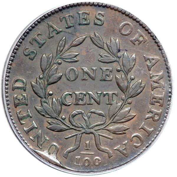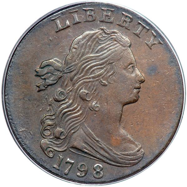 1798 S-175 R3 Style II Hair, Small 8. PCGS graded AU-50. Attractive glossy light to medium chocolate brown with frosty lighter steel brown toning in protected areas, especially on the reverse. A small puff of darker olive toning shows in the field before the eye. Sharply struck with excellent eye appeal. The only marks are a couple old, light hairline scratches at LI, another even lighter one slanting from the temple to the upper lip, and one between the F in OF and the adjacent A. All these fine scratches blend perfectly into the attractive natural toning. LDS, Breen state VI, with a strong cud break connecting the U in UNITED to the rim. All the fine die cracks described by Breen for the latest die state are clear. Our grade is EF40+, close to EF45. An important cent, CC#5 for the variety. Apparently a new discovery, not listed by Noyes or Bland.