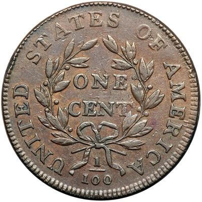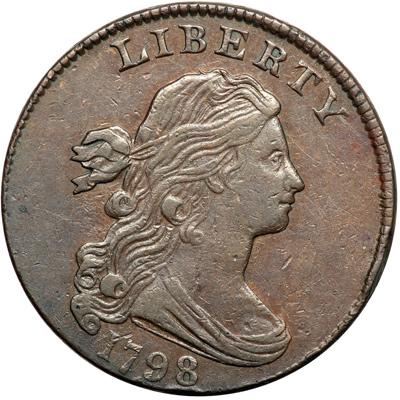 1798 S-176 R4 Style II Hair with Small 8. VF-30. Sharpness EF40 with too many light contact marks for that sharpness. The most obvious mark is a dull rim bruise right of the chin, and tiny rim bruises under the 8 in the date and at D-S can also help identify this cent. No corrosion, spots, or stains. Glossy chocolate and steel brown with frosty lighter brown toning in protected areas of the reverse. Sharply struck E-MDS, Breen state II. The vertical die polishing lines in the field under the chin are strong. Called EF40 net VF30 and tied for CC#3 by Bland. Noyes has this one as VF35 net VF25 and tied for CC#4, his photo #21462. DWH #2787.