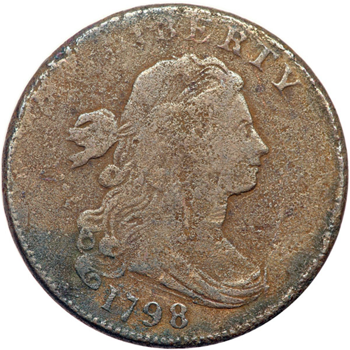 1798 S-177 R4+ Small 8, Style II Hair G5. Five points sharper but covered with very fine porosity with a patch of moderate roughness at UNIT. No verdigris or notable marks. Dusty steel brown and light chocolate offering just a bit of gloss. MDS. The date is bold and the legends are complete except for UNIT and ONE, which are weak.