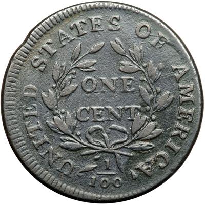 1798 S-177 R5- Style II Hair with Small 8. Fine-15 Plus. Clipped Planchet. Five points sharper with extremely fine granularity under a glossy dark olive brown patina. The highpoints are a few shades lighter than the protected areas, and the eye appeal is rather nice for the grade in spite of the minor roughness. No verdigris, and the only marks are some small rim nicks at the top of the obverse, a couple faint hairline scratches on the neck, and a small planchet depression in the field off the left base of the L in LIBERTY. The date and legends are strong. LDS, Breen state V, with a patch of strong die rust right of the bust tip. In addition, there is a small planchet clip left of the middle curls and at the opposing dentils over ST, as struck. DWH #3199.