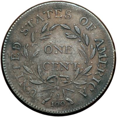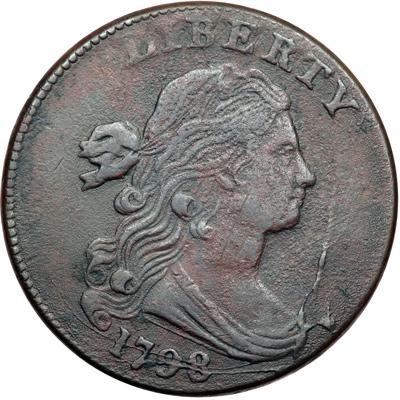1798 S-178 R5+ Style II Hair with Small 8. Reverse of 1796. Fine-15. Sharpness VF35 with fine to moderate granularity covering the obverse, although it is difficult to differentiate between the ever-present die rust and any added environmental damage. The rims and reverse are not similarly affected, although they are not perfectly smooth, either. Both sides show some extremely fine verdigris dust but nothing that could be called active corrosion. The obverse is a slightly glossy dark reddish chocolate and olive brown while the reverse is a few shades lighter and is void of the reddish tints. Very rare LDS, Breen state IV, with all the obverse and reverse die cracks strong, including the fine cracks at the top of the reverse. Not perfect but rather nice for this very tough die variety, and a choice example is not known in any grade. In the middle of the condition census, perhaps tied for CC#3 with the ANS Museum example based on a photo comparison. Removed from an NCS slab graded AU details corroded (NCS label included, and it shows the attribution). DWH #3200.