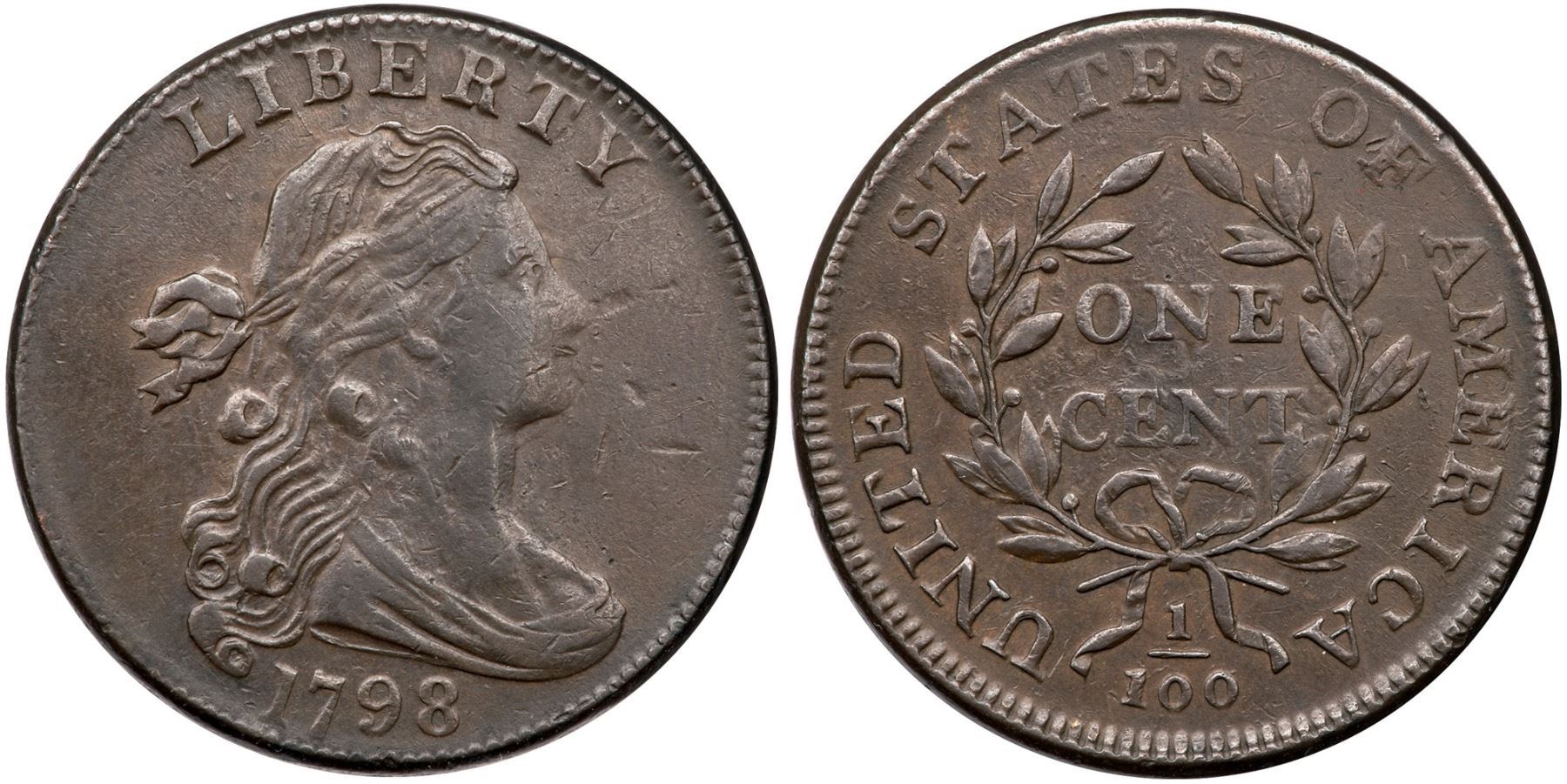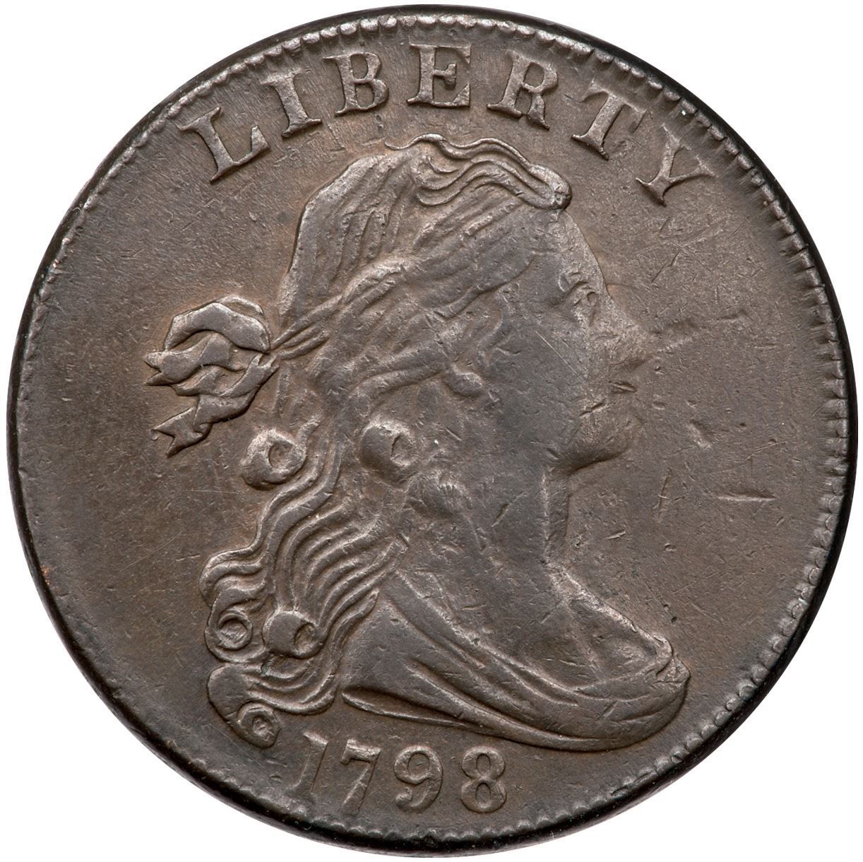 1798 S-179 R-2 VF25A few points sharper but appears struck through some grease around the profile. There are a couple minor nicks before Liberty's chin and another at F in OF. Glossy chocolate and olive browns with hints of light brown underneath. Smooth surfaces.Certificate Number: Pedigree: Ex; Tim Paquette