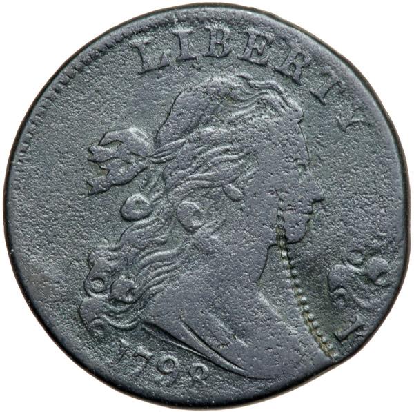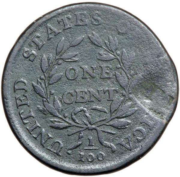 1798 S-179 R2 Small 8, Style II Hair G6. Double Struck over Off Center Obverse Brockage. Sharpness near F12 but covered with fine to moderate roughness under a slightly glossy dark olive and steel patina. No notable contact marks or verdigris. Close to VG7. Double struck. One strike was normal and another was an obverse brockage struck 65% off center to K-3. The 1 and some of the lower curls of the normal side of the off center strike are visible in the field before the portrait. The reverse displays an incuse impression of LI (from LIBERTY) right of the T in CENT from the off center brockage strike. This brockage impression does not line up with the obverse impression left by the off-center strike suggesting things were really jammed up at this point. An impressive multiple mint error (double strike, off center, obverse brockage). The date and legends are clear for what remains of the centered strike.