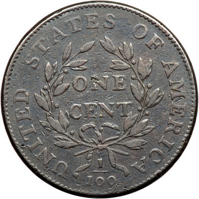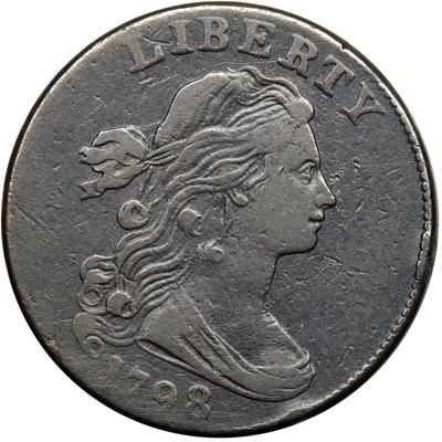 1798 S-180 R5+ Style II Hair with Small 8. Fine-15. Five points sharper with some light contact marks, including a light rim bruise under the tip of the bust, another opposite the chin, a swipe of very fine diagonal hairline scratches through the date, and a nick on the left top of the N in ONE. Glossy dark steel brown and olive with slightly lighter steel brown toning on the highpoints. Extremely rare EDS, Breen state I, before the cud break at ATE. Called F15 and tied for CC#5 in the Bland census. Noyes says VF25 net F12 and tied for CC#6 (but tied for CC#1 of the EDS), his photo #22925. DWH #2641.