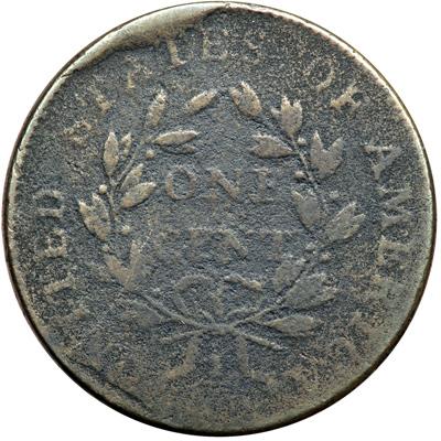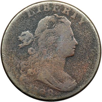 1798 S-180 R5+ Style II Hair with Small 8. Good-4 Plus. A few points sharper but covered with uniform microscopic porosity. No marks or verdigris. Dark olive and chocolate brown with some gloss showing on the obverse highpoints. The date is easily readable but the lower part is weak, as usual due to the opposing cud break at TATE, which is strong on this example. The legends are complete except for weakness on the fraction. M-LDS, Breen state IV late, with a sunken retained cud break at UN where the terminal cud break is about to occur. Only 2 known in this die state, and the second is unconfirmed. DWH #3201.