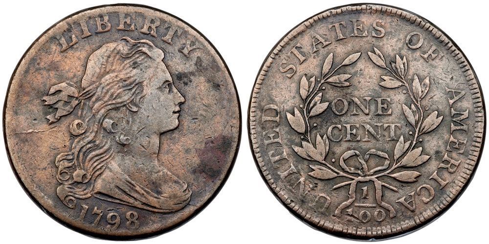 Sharpness F15 with a couple small patches of very fine corrosion in the field before the portrait and another at the O in ONE. A nick on the 1 in the denominator is the only notable contact mark. Slightly glossy mottled mix of olive brown and light chocolate with a few small puffs of reddish brown on the obverse. Possibly recolored. MDS, Breen state II, with die cracks on the obverse and the reverse rotated 45 degrees CCW. The Large 0's over Small 0's in the denominator are clear. Ex "W. H. C. C." 12/5/1962-Lucien Birkler Collection