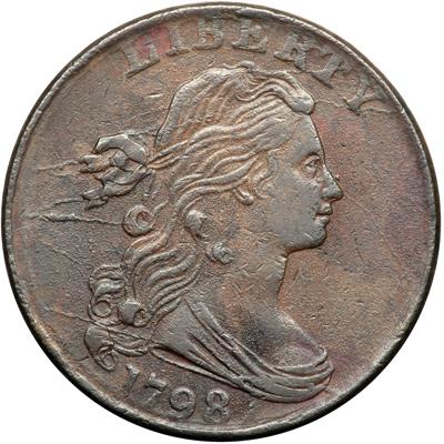 1798 S-181 R3 Style II Hair with Small 8. EF-40. Rotated Reverse. Frosty mottled mix of chocolate, steel brown, and reddish brown with some lighter brown toning in protected areas of the reverse. There are some tiny nicks hidden in the fine die rust, none notable, and a very light rim bruise at the O in OF. LDS, Breen state IV. Both sides are covered with fine die rust and a slightly raised retained cud break connects the bust to the rim right of the date. The reverse is rotated 40 degrees CCW. Called EF40 and tied for CC#6 in the Bland census. DWH #3057.