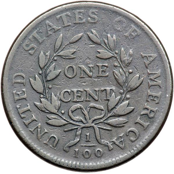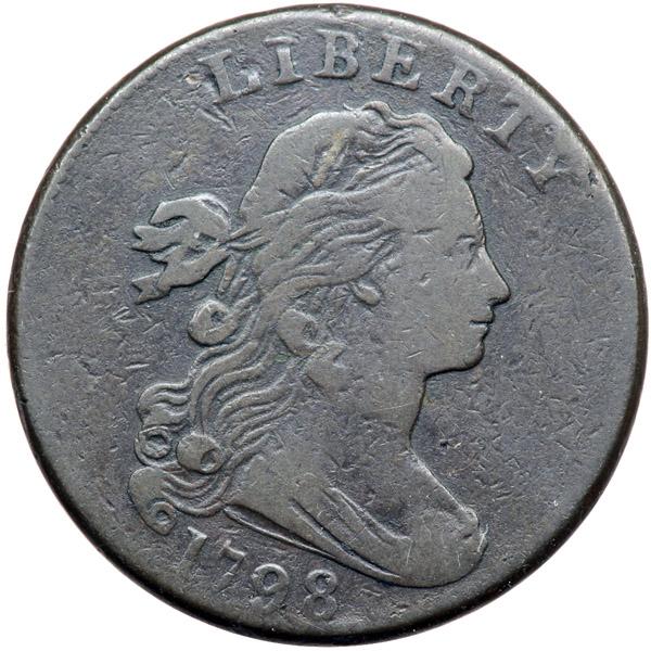 1798 S-184 R1 Style II Hair, Small 8 VG10. Choice glossy olive brown and chocolate with steel brown toning on the devices. Smooth and very nice for the grade. A dull rim nick over the B in LIBERTY can help identify this piece. EDS.
