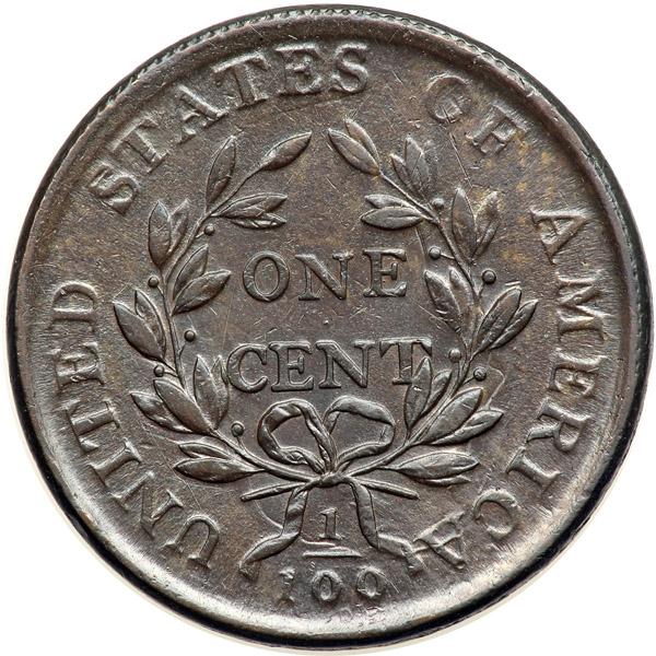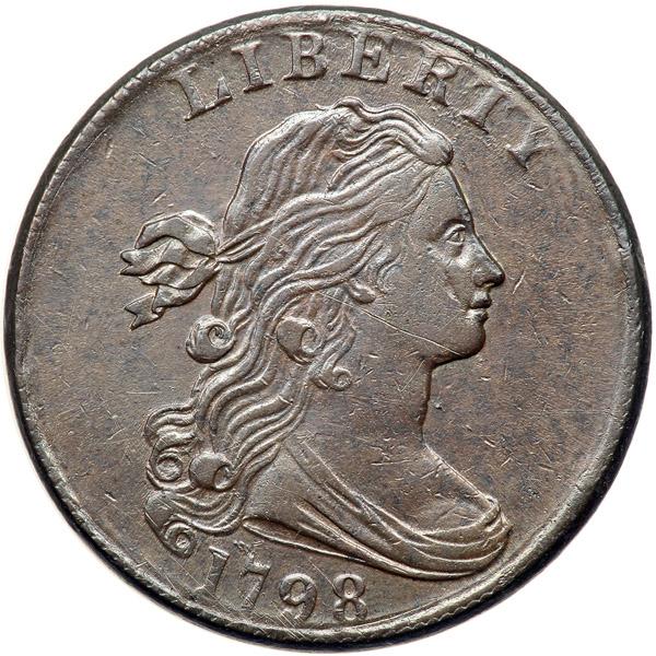 1798 S-184 R1 Style II Hair with Small 8 EF40. Sharpness EF45 or slightly better but there is hairline scratch from just under the earlobe to the jaw plus some faint scratches at the date and curl to the left. Frosty steel brown and chocolate blending to olive brown. Satiny luster covers the protected areas. LDS, Breen state IV. The rim cud at F-A is clear and the die clashmarks of the latest state are present.